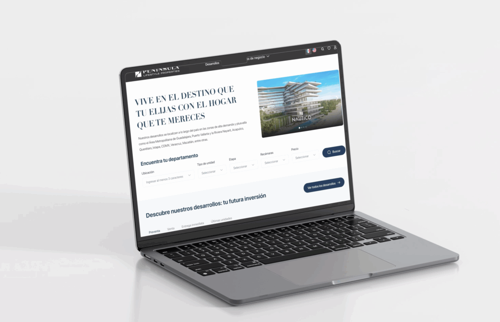 Conoce más de Península Fecha28-Julio-2025 Más desarrollos, más opciones y más sencillo ¡Nos transformamos para ti! Entra a peninsula.mx y con un fácil registro, encuentra un home con nuestros proyectos en los destinos más emblemáticos de México. Elige tu favorito al instante o busca uno con características específicas en nuestro motor de búsqueda avanzado. Encuentra tu departamento al determinar la ubicación deseada, el tipo de unidad, la etapa del desarrollo, la cantidad de recámaras y un rango de precio. ¡Decídete al que mejor se ajuste a tu estilo y presupuesto! Una vez que elijas tu proyecto, accede a una sección personalizada con su descripción, amenidades, fotos y mucho más. ¡Conoce tu inversión a detalle! Vive esta experiencia de compra con asesoría personalizada, podrás consultar a uno de nuestros expertos durante tu proceso, al dar clic o llenar el formulario de contacto. Y así, reservar tu unidad residencial de forma sencilla y sobre todo, rápida. Accede y visualiza tus departamentos reservados o en proceso de apartado en tu cuenta, donde además podrás agregar o modificar la información de tu perfil. También, en nuestro relanzamiento integramos una sección destinada a Premium Society, un nuevo modelo de inversión que te ofrece beneficios únicos y exclusivos. Descubre nuestra nueva experiencia y comienza tu destino como inversionista en peninsula.mx ¡Tu futuro está a un clic de distancia!